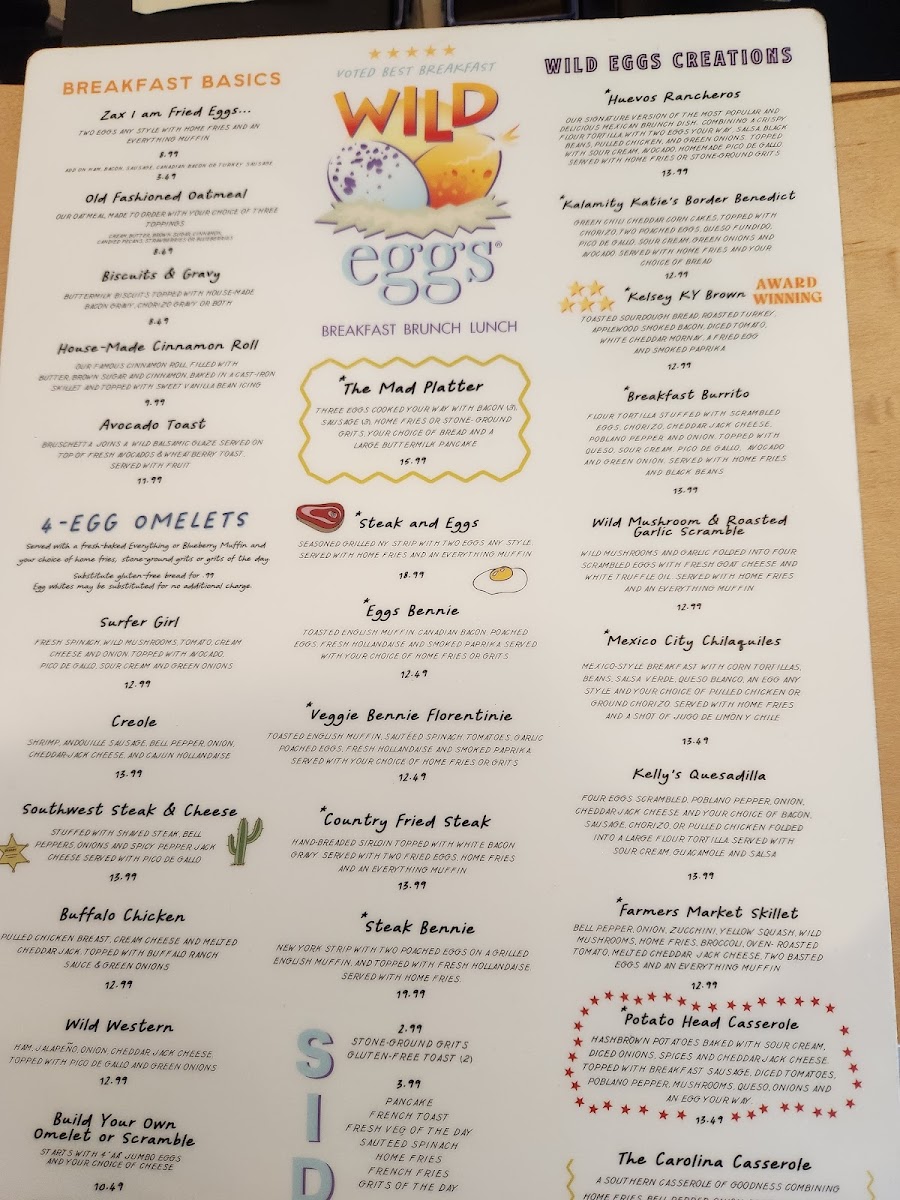 A southern casserole of goodness combining home fries, bell pepper, onion, diced ham, crumbled bacon, cheddar cheese, Monterey Jack cheese, white bacon gravy, and topped with two eggs your sway. Served with your choice of bread or fresh muffin.